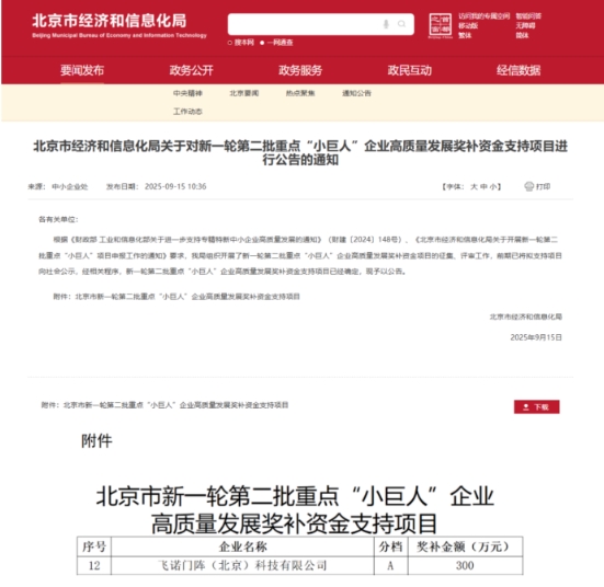 近期,飞诺门阵获评国家级重点“小巨人”荣誉,成功入选北京市新一轮第二批重点“小巨人”企业高质量发展奖补资金支持项目A档,正式跻身国家战略科技力量的核心梯队,实现“国家级双认定”。9月15日,北京市经济和信息化局正式发布《新一轮第二批重点“小巨人”企业高质量发展奖补资金支持项目》公告名单,飞诺门阵凭借前瞻性的技术布局、行业主导性及产业带动能力等方面的突出表现,成功跻身国家级重点“小巨人”企业行列。国家级重点“小巨人”企业,是由工业和信息化部从已认定的国家级专精特新“小巨人”企业优中选优遴选出的国家级标杆企业,聚焦国家重点产业链、工业“六基”以及战略性新兴产业和未来产业领域,具有专业化、精细化、特色化、新颖化特征,在关键技术突破和产业链配套中发挥关键作用;入选企业将获得财政连续3年的重点支持,用于技术研发和产业链升级。此次入选不仅是飞诺门阵发展历程中的重要里程碑,也是国家对其持续创新能力与产业引领价值的有力印证,更预示着飞诺正式开启服务国家战略、推动产业升级的新征程。